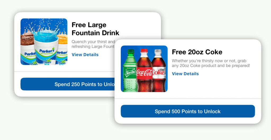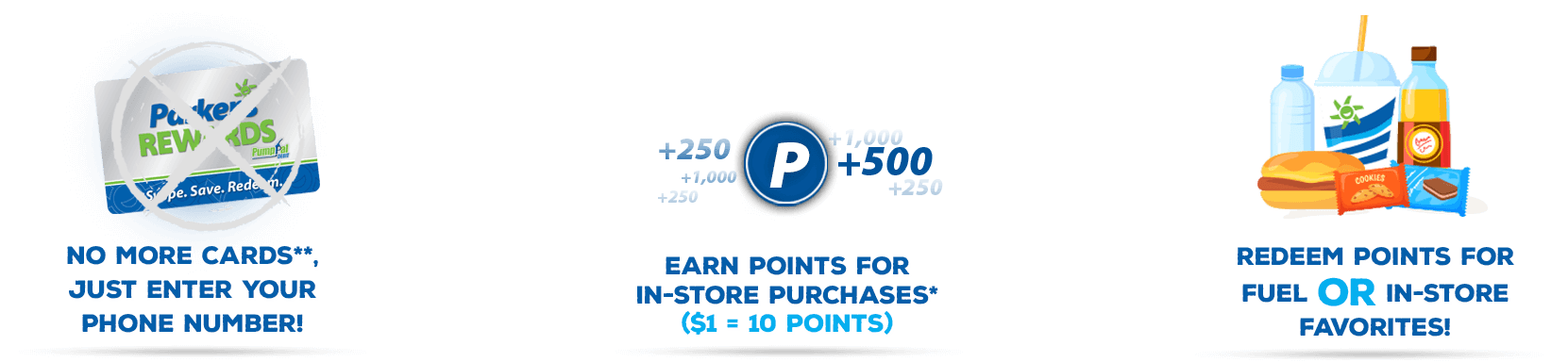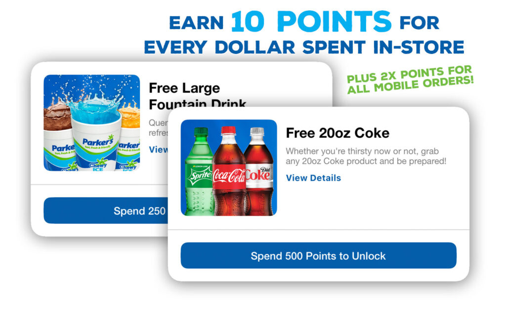 * Tobacco, lottery, gift card & fuel purchases do not earn Rewards points. Purchases at Parker’s Spirits earn 5 Rewards point for every $1 spent.